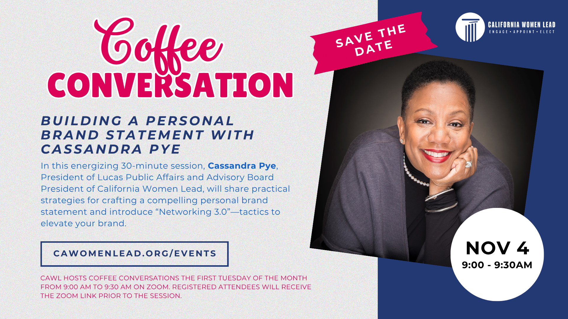 Join us for our next Coffee Conversation featuring Cassandra Pye, President of Lucas Public Affairs and Advisory Board President of California Women Lead.