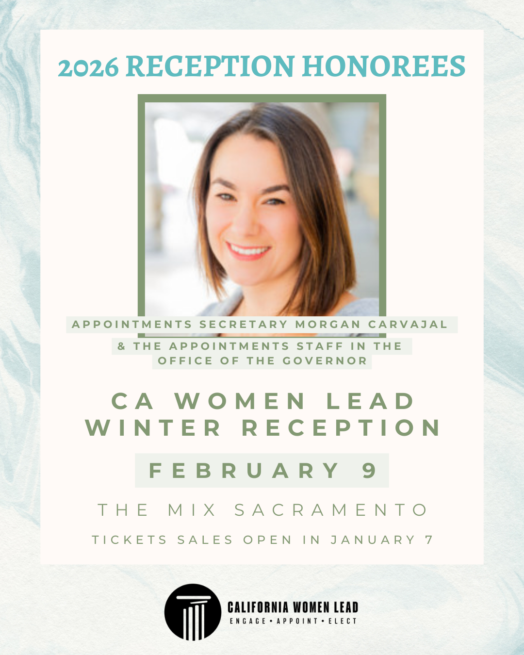 Join us at California Women Lead’s Annual Winter Reception as we honor Appointments Secretary Morgan Carvajal and the Appointments staff in the Office of the Governor for their years of dedicated public service. The Appointments Secretary and her team play a pivotal role in shaping California’s leadership landscape, and their work has a lasting impact on representation, equity, and leadership in California. This annual gathering brings together influential women leaders from across California’s public and private sectors to celebrate our shared achievements, uplift one another, and inspire future leadership.