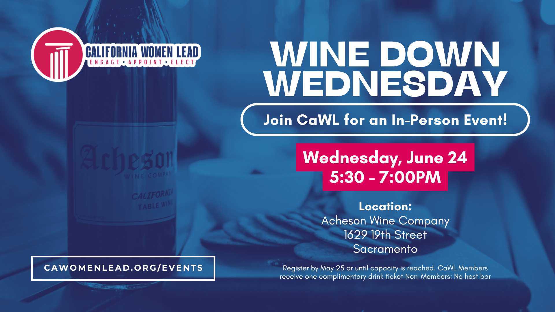 Join California Women Lead (CaWL) once again as we host Wine Down Wednesday at Acheson Wine Company in Sacramento at 1629, 19th Street. This is a casual evening of connection, conversation and good wine. Non-alcoholic options and lite bites are provided.