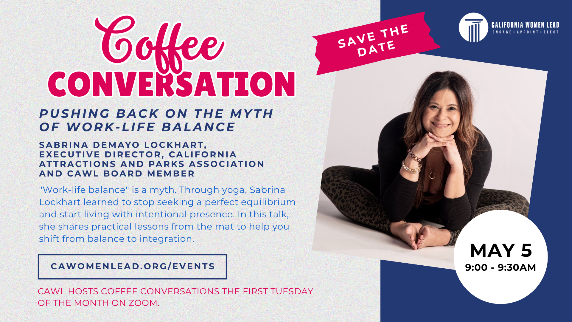 Join California Women Lead for our next Coffee Conversation on May 5 from 9:00 am to 9:30 am for Pushing Back on the Myth of Work-Life Balance with Board member Sabrina Demayo Lockhart.